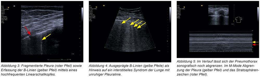 Bildgebende Verfahren sind nicht dazu geeignet sicher die spezifische Diagnose einer COVID-19-Pneumonie zu stellen, sondern zeigen nur die Zeichen und die Ausdehnung einer pulmonalen Erkrankung. Für die Diagnosestellung ist die Zusammenschau aus Klinik des Patienten, Vitalparametern, Bildgebung sowie laborchemischer und virologischer Diagnostik entscheidend. Die Rolle des Ultraschalls in der Diagnostik und Verlaufskontrolle von COVID-19-Pneumonien wurde – wie auch die CT-Diagnostik – aufgrund der Kürze der Krankheitserstbeschreibung noch nicht abschließend bewertet. Größere klinische Studien fehlen bislang. Dennoch erscheint bei peripherer Lage die Ultraschalldiagnostik die meisten CT-Kriterien ebenso gut aufzeigen zu können, sodass die Ultraschalldiagnostik zur Verlaufsbildgebung von Patienten auf der Intensivstation zum Einsatz kommen kann. Mittels Ultraschall können im Verlauf Konsolidierungen des Lungenparenchyms und Aerobronchogramme (zum Beispiel auch bei Superinfektionen) dargestellt werden, ebenso wie neu auftretende oder zunehmende Pleuraergüsse oder andere Lungenpathologien, wie etwa ein Pneumothorax. Die Ultraschalluntersuchung der Lunge sollte unter größtmöglichem Eigenschutz und unter strenger Beachtung der klinikinternen Hygieneauflagen durchgeführt werden. Wir empfehlen standardisierte Untersuchungsbögen für die Durchführung und Dokumentation des Lungenultraschalls (zum Beispiel der gemeinsame Bogen der deutschsprachigen Ultraschallfachgesellschaften unter www.degum.de).
