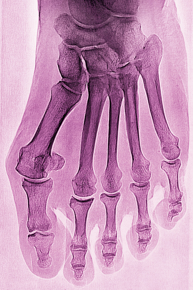 Diagnostisch stellt die Inspektion des Fußes und der gesamten unteren Extremität einen wesentlichen Bestandteil der Untersuchung dar. Die trophischen Hautveränderungen, welche in der Regel medial am Metatarsale-I-Kopf liegen, geben einen ersten Eindruck von Druckproblemen. Fehlstellungen der benachbarten Zehenstrahlen können durch die verdrängende Wirkung des Hallux valgus entstehen (Abbildungen 1a, 2a, 3a). Überlastungsprobleme oder sich eingestellte Fehlstellungen (Krallenzehen oder Hammerzehen) der Nachbarstrahlen sind zu erfassen und gegebenenfalls therapeutisch zu adressieren. Bestehende Hilfsmittel (Einlagen, Schuhzurichtungen, orthopädisches Maßschuhwerk) sollten hinsichtlich ihrer therapeutischen Wertigkeit beurteilt werden.