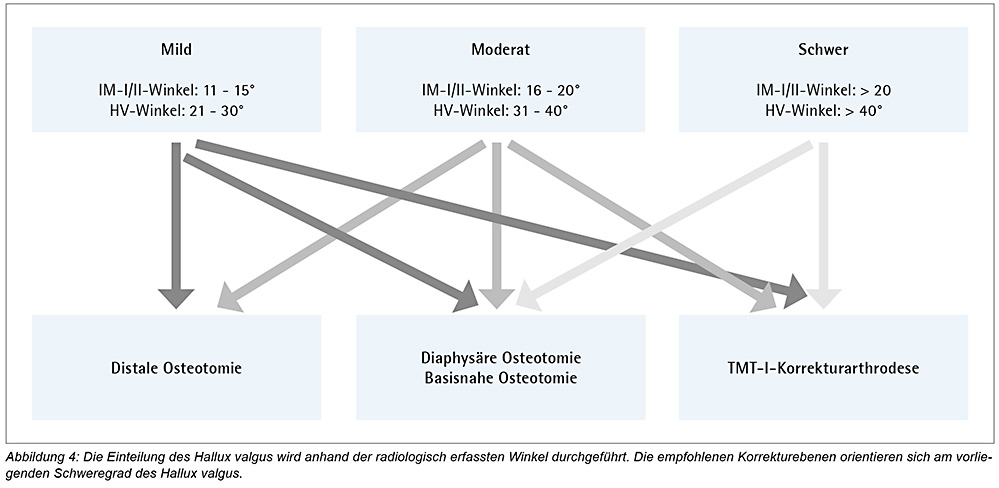 Die Belastungsaufnahme ermöglicht die Bestimmung der spezifischen Winkel, die die therapeutische Entscheidung beeinflussen. Der Intermetatarsale-Winkel I/II (IM-I/II-Winkel) stellt den Eröffnungswinkel zwischen dem Metatarsale-I-Knochen und Metatarsale-II-Knochen dar. Der Hallux-valgus-Winkel (HV-Winkel) wird zwischen dem Grundglied DI und dem Metatarsale-I-Knochen gebildet. Die Einteilung des Hallux valgus in Schweregrade basiert auf diesen ermittelten Winkelwerten. In Abbildung 4 wird die von der Leitlinienkommission der D.A.F. empfohlene Einteilung dargestellt.