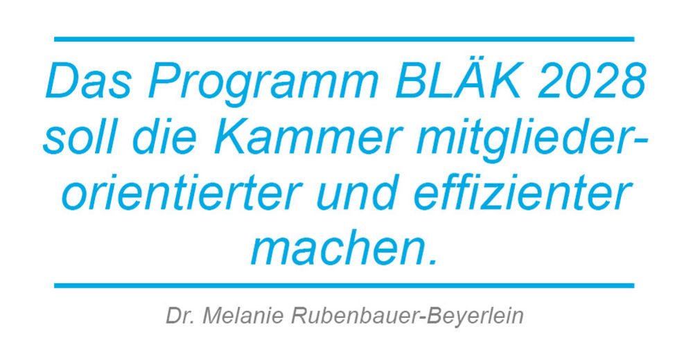 Rubenbauer-Beyerlein: Das Programm BLÄK 2028 soll die Kammer mitgliederorientierter und effizienter machen. Ein zentraler Bestandteil ist die Digitalisierung, die die Arbeitsprozesse erheblich verbessern soll. Dazu wurde im ersten Schritt eine strukturierte Evaluation der Kammer mit externen Beratern durchgeführt, um die Leistungsfähigkeit der Organisation objektiv zu prüfen und konkrete Verbesserungspotenziale aufzuzeigen. Ziel ist es, nicht nur effizient zu arbeiten. Wir wollen auch motivierte Mitarbeitende haben, die durch schlanke Prozesse unterstützt werden. Gleichzeitig soll die Kammer die Interessen der bayerischen Ärzteschaft weiterhin kompetent vertreten. Dazu muss die Kammer als Institution die fachliche Kompetenz bieten, die nötig ist, um die Anliegen der Ärzteschaft erfolgreich zu vertreten und den Herausforderungen einer sich wandelnden Gesundheitslandschaft gerecht zu werden.