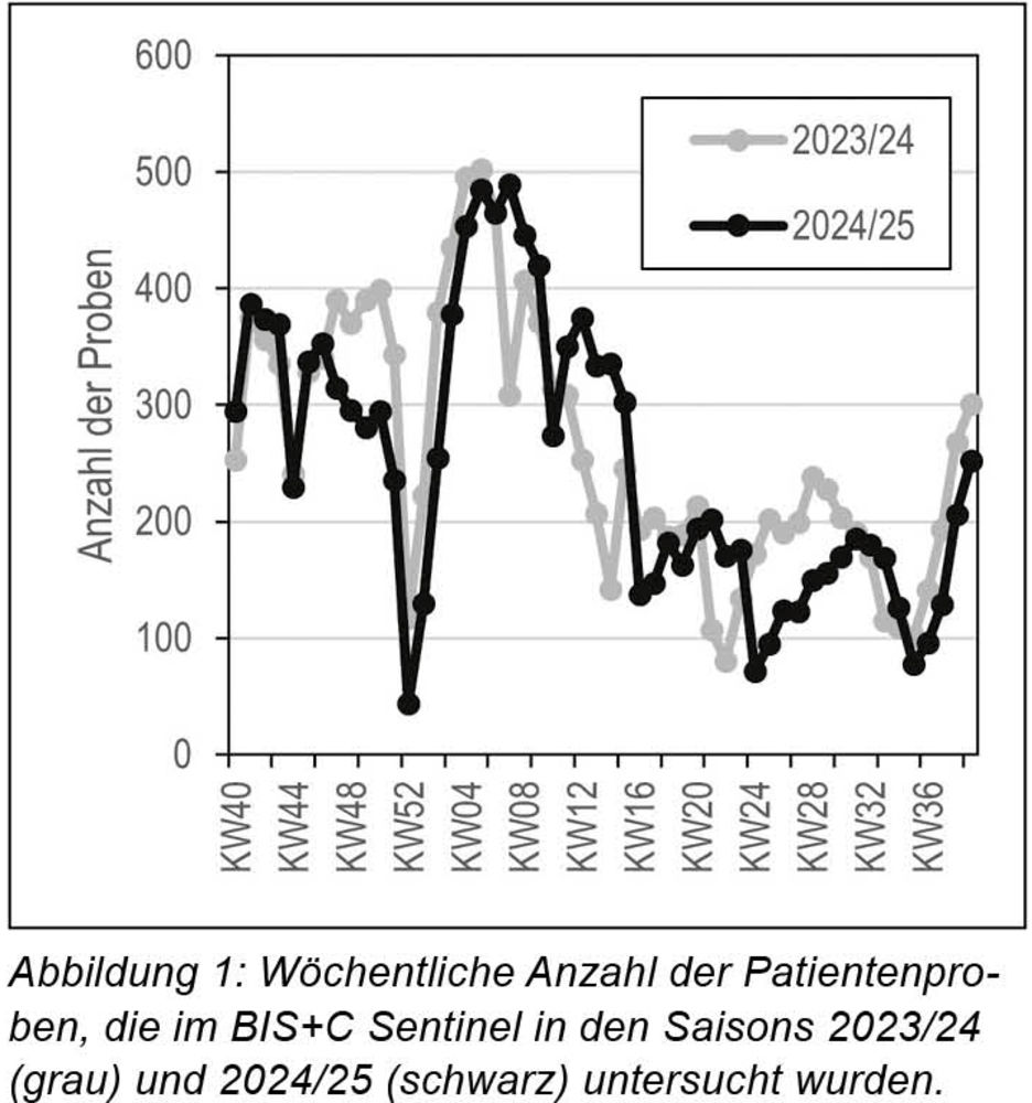 Die Anzahl der teilnehmenden BIS+C Sentinel Praxen konnte von 196 in der Saison 2023/24 auf 204 in 2024/25 gesteigert werden. Die Anzahl der eingesendeten Patientenproben blieb stabil bei ca. 250 Proben pro Woche (Abbildung 1),