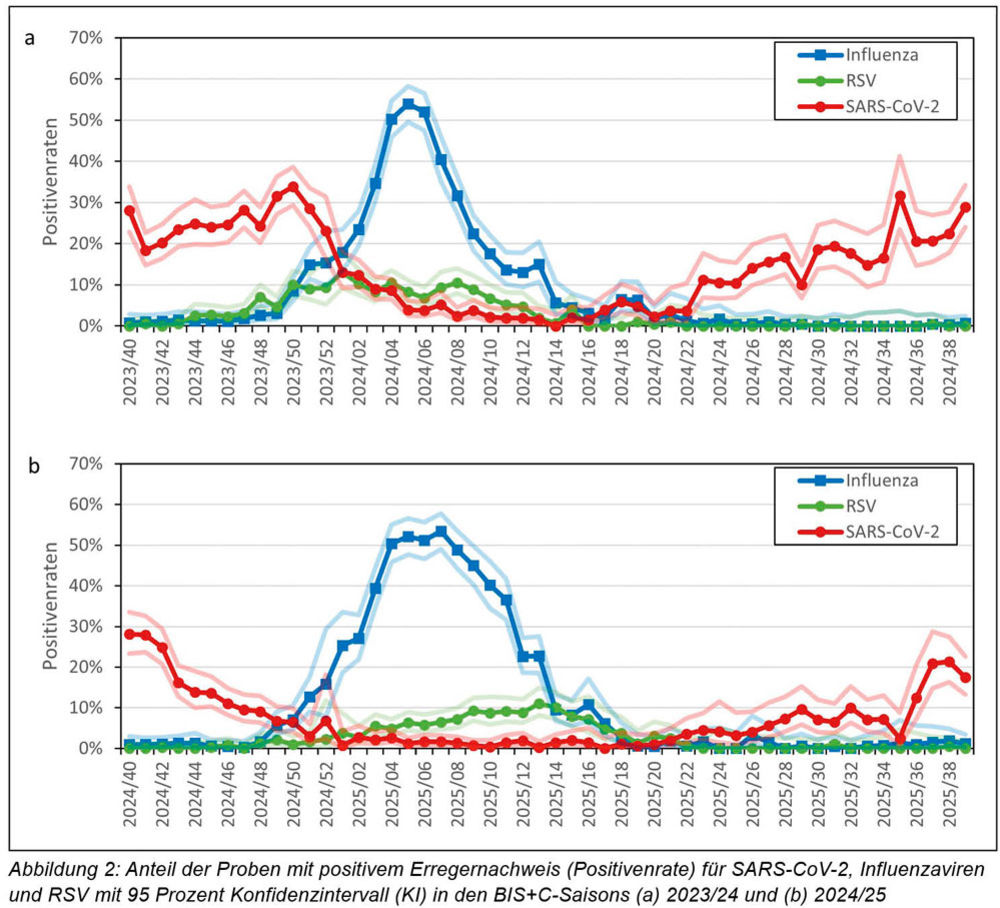Eine Positivenrate von über 10 Prozent wurde von KW 33/2023 bis KW 2/2024, sowie erneut zwischen KW 23/2024 bis KW 46/2024 beobachtet. In der Saison 2024/25 stieg die SARS-CoV-2 Positivenrate ab KW 36/2025 auf über 10 Prozent an. Die Maxima der Positivenraten in der Saison 2023/24 lagen bei etwas über 30 Prozent, wohingegen das bisherige Maximum der aktuellen SARS-CoV-2 Welle bei ca. 20 Prozent liegt.