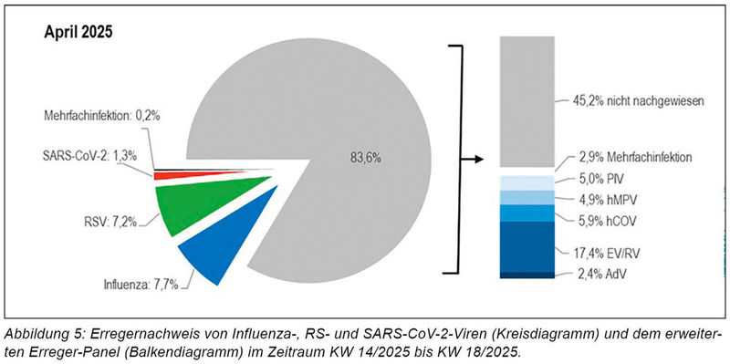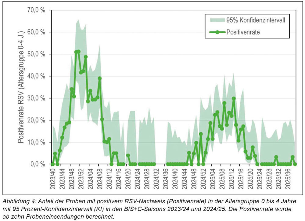 In der Saison 2024/25 begann die Welle später (KW 3/2025 bis KW 17/2025). Die maximale Positivenrate lag bei 29,9 Prozent [KI 41,7 Prozent – 20,2 Prozent] in KW 13/2025. Der Anteil der Säuglinge, die eine RSV-Prophylaxe erhalten haben oder deren Mutter während der Schwangerschaft geimpft worden sind, erhöhte sich in der Altersgruppe < 1 Jahr von < 1 Prozent
