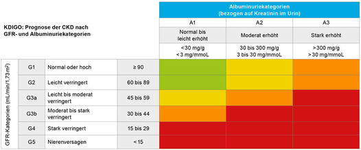 Die CKD wird definiert als eine strukturelle oder funktionelle Veränderung der Nieren, die für mindestens drei Monate besteht. Die Klassifikation der CKD erfolgt anhand der Ursache, der glomerulären Filtrationsrate (GFR) in den Stadien G1 bis G5 sowie des Ausmaßes der Albuminurie in den Stadien A1 bis A3. Patientinnen/Patienten mit einer niedrigeren GFR und einer höheren Albuminurie, die mittels des Urin-Albumin-Kreatinin-Verhältnisses gemessen wird, weisen das höchste Risiko für eine progrediente CKD und das Fortschreiten zum Nierenversagen auf [3]. Letzteres erfordert eine Nierenersatztherapie, sei es durch Dialyse oder Nierentransplantation.