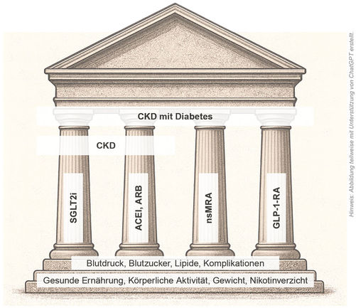 Abbildung 2: Therapiesäulen bei chronischer Nierenkrankheit. ACE-Hemmer und AT1-Rezeptorblocker sollten bei Vorliegen einer Albuminurie die Erstlinientherapie zur Blutdruckkontrolle sein, SGLT2-Hemmer sollten in allen CKD-Stadien bei (fast) allen Nierenkrankheiten ebenfalls primär eingesetzt werden, insbesondere bei gleichzeitigem Vorliegen einer Albuminurie. GLP-1-Agonisten und nicht-steroidale Mineralokortikoid-Rezeptor-Antagonisten kommen derzeit nur bei CKD-Patienten mit Diabetes zum Einsatz. Die medikamentösen Ansätze ersetzen jedoch nicht die Basismaßnahmen, wie zum Beispiel Lebensstilmodifikationen [3].