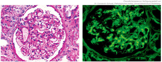 Abbildung 3: IgAN. Links PAS, rechts Immunfluoreszenz. Es zeigt sich eine mesangiale Proliferation mit den typischen mesangialen Ablagerungen von IgA.