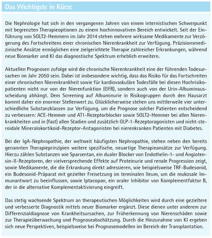 Auch in anderen Bereichen wachsen die therapeutischen Möglichkeiten derzeit fast täglich. Durch den Einsatz präzisionsmedizinischer Ansätze können Erkrankungen gezielt behandelt werden, etwa mit siRNA bei primärer Hyperoxalurie oder mit Komplementtherapeutika bei aHUS, C3-Glomerulopathie und anderen Erkrankungen. Zelltherapien, wie etwa CAR-T-Zellen, werden im Rahmen klinischer Studien zur Behandlung immunvermittelter Prozesse eingesetzt, beispielsweise in der Transplantationsmedizin und bei Autoimmunerkrankungen. Zudem steht die Nephrologie an der Schwelle zu einem neuen Zeitalter des Organersatzes durch die Transplantation genmodifizierter Schweinenieren.