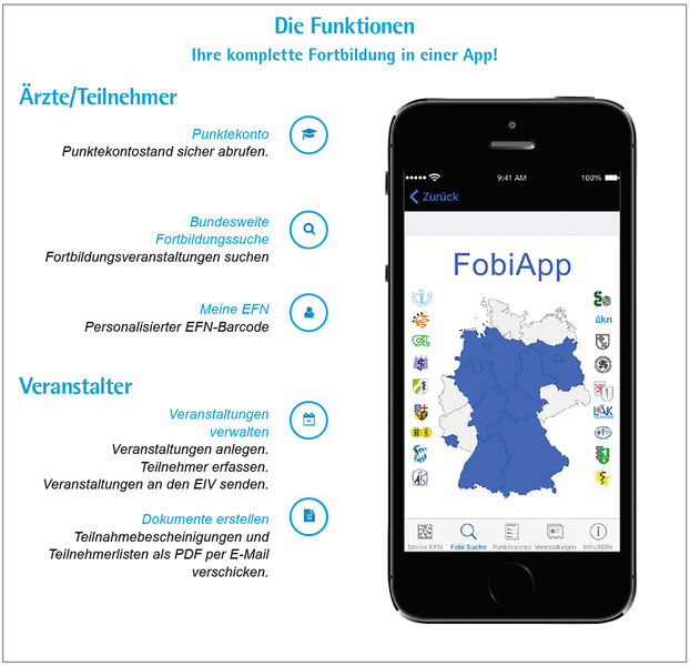 Ob Fortbildungspunkte, Fortbildungssuche oder Veranstaltungsorganisation – Nutzen Sie jetzt die wichtigsten Funktionen Ihrer Ärztekammer. Egal, wo Sie gerade sind. Kostenlos! Behalten Sie stets Ihr Punktekonto im Blick und sehen aktuell und mobil jederzeit Ihren aktuellen Punktestand ein. Sind Sie auf der Suche nach einer Fortbildungsveranstaltung oder sind selbst Veranstalter? Haben Sie Ihren Barcode-Aufkleber versehentlich vergessen? Nutzen Sie die praktischen Funktionen der FobiApp!